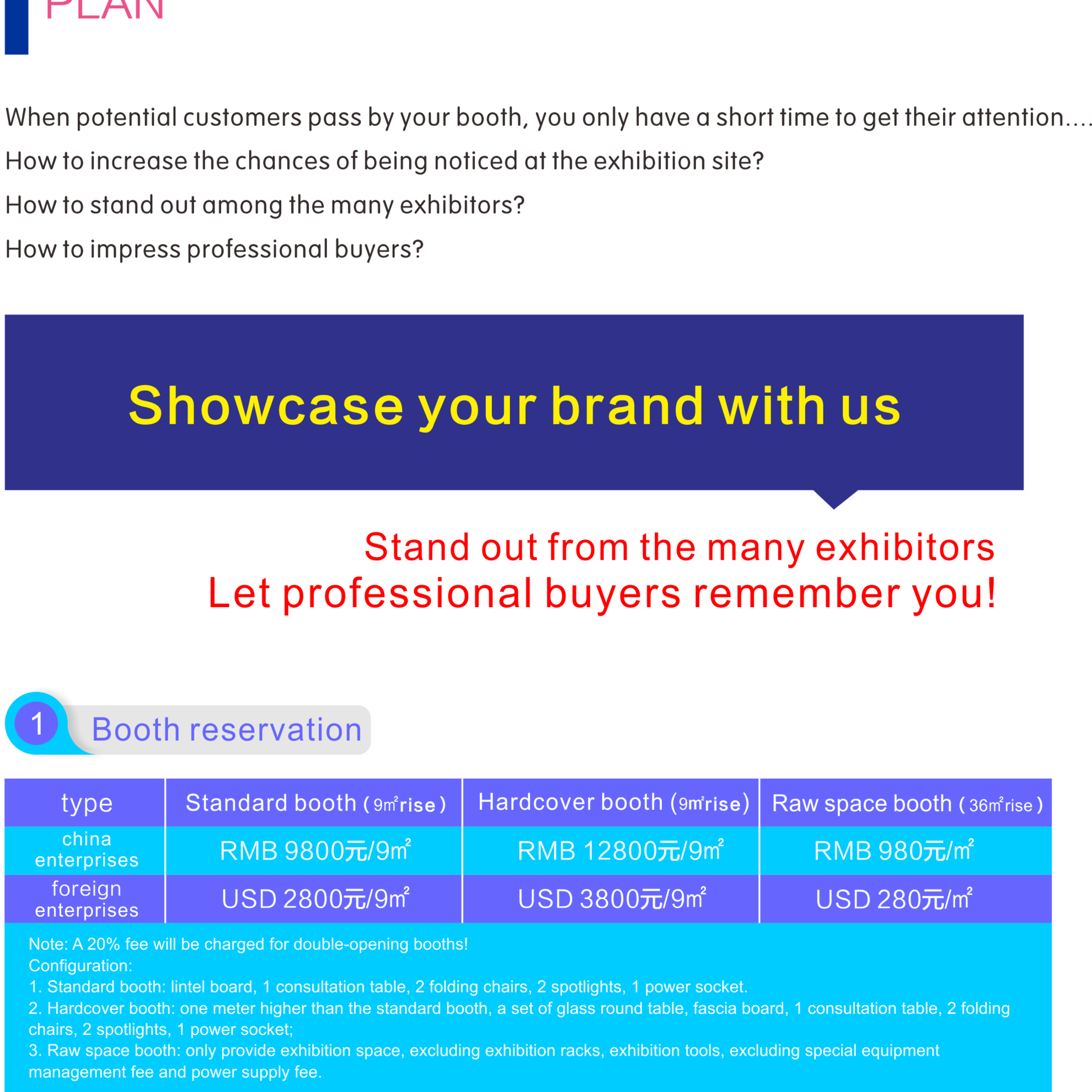 The booth reservation Exhibition hall introduction Exhibitor Manual Participation fees Package plan Advertising costs Participation process Logistics Services Traffic routes Exhibition equipment rental Electricity/gas lease